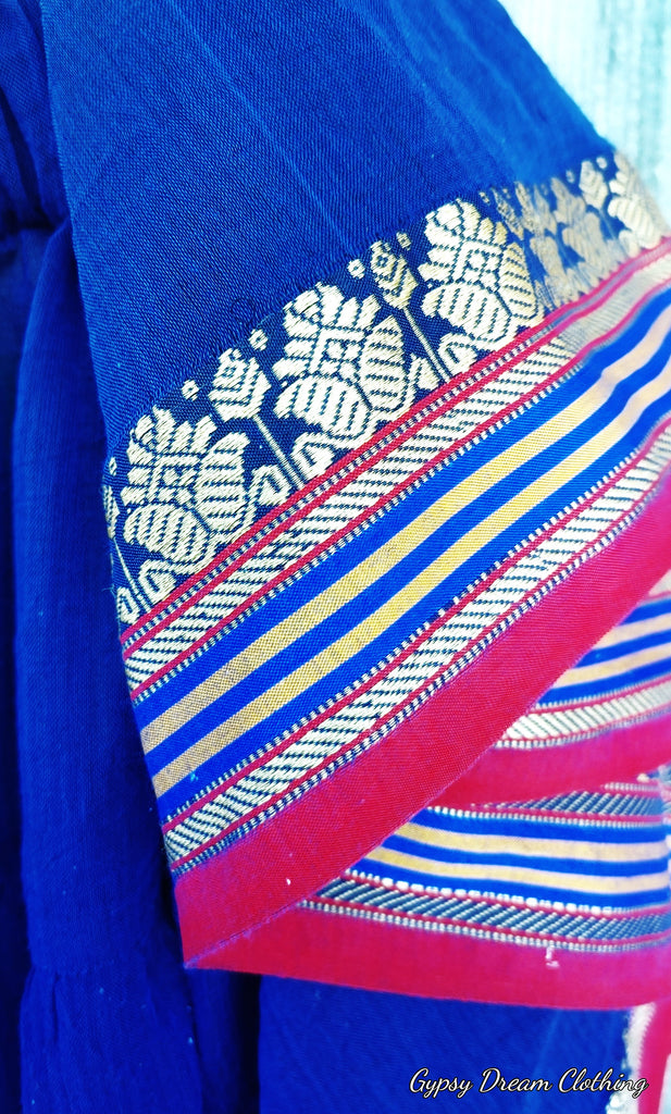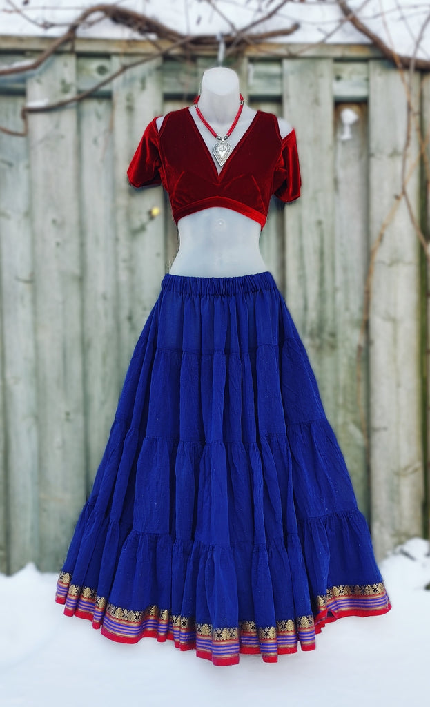 Introducing NEW Midnight Blue! This new iridescent deep BLUE colour is a blend of Royal Blue threads, woven together with Black to create this shade of Midnight Blue. An exciting new skirt trim featuring an embroidered Metallic Gold floral pattern set in a bright RED band. This Padma skirt is very versatile and looks fantastic when layered over other bright skirts, as well as earth tones and jewel tones! Handmade in Canada from 100% pre-shrunk, lightweight cotton, this four-tier skirt features a bottom tier that measures just over 12 yards in circumference. A 2-inch-wide non-roll elastic at the waistband provides a comfortable, secure fit.